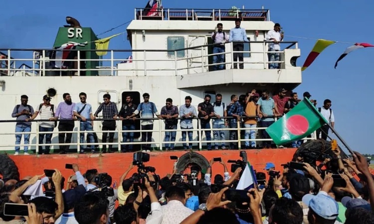 চট্টগ্রাম বন্দরের জেটিতে পৌঁছেছে সোমালীয় জলদস্যুদের জিম্মি দশা থেকে মুক্তি পাওয়া ২৩ নাবিককে নিয়ে এমভি জাহান মনি-৩। ১৪ মে, মঙ্গলবার